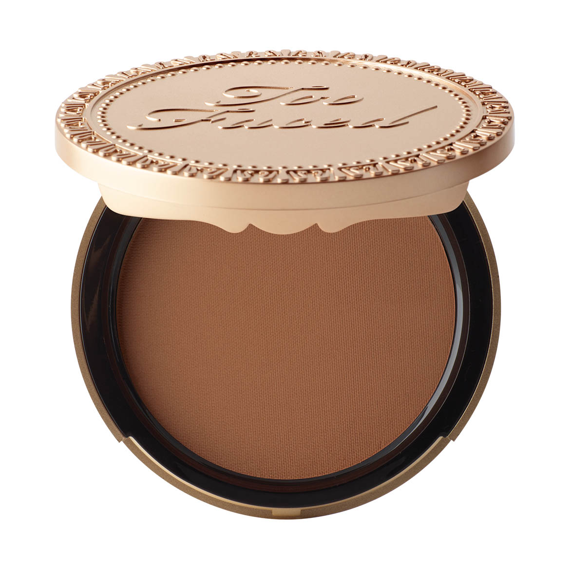 Too Faced – Dark Chocolate Soleil deep / tan matte bronzer este inspirata din varianta sa mai deschisa (Chocolate Soleil Bronzer), un best – seller al brandului. Este plina de anti-oxidanti, datorita pudrei de cacao – care miroase delicios, nu are particule irizate, de aceea este foarte potrivita si pentru conturarea fetei.
